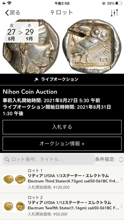 日本コインオークションは創業31年を超える国内初のコイン専門オークションハウスです。株式会社ダルマが携わる長年培った専門知識を世界へ発信するオークション入札アプリ。こちらのアプリをご登録いただくことで日本コインオークションへのリアルタイムオークションへの参加が可能になります。 オークション未経験のお客様はこの機会にご登録を歓迎致します。 オークションウェブサイトに掲載された競売品は注記(ファンタジー、レプリカ等)のない限り競売開催時において真正品であると判断したものですので安心してお買い求めいただけます。 世界中のお客様が参加可能なオークションシステムの為、出品された際は世界市場価格に沿った落札結果が期待出来ます。 アプリの特徴 ・外出先でも簡単にオークションへ参加出来ます。 ・入札した出品物が高値更新された際はプッシュ通知によるお知らせ機能付き。 ・アプリで出品物のコンディションを簡単にチェック出来ます。