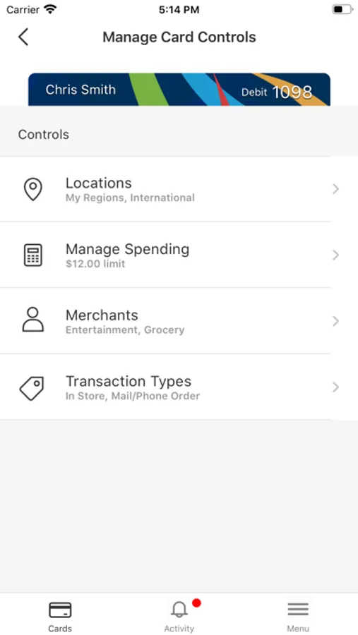 Spending limits can be established to allow transactions up to a certain dollar value and decline transactions when amounts exceed your defined thresholds. Transactions can be monitored and managed for specific merchant categories such as gas stations, department stores, restaurants entertainment, travel, and groceries. And your transactions can also be monitored for specific transaction types: in-store purchases, e-commerce transactions, mail/phone orders and ATM transactions.