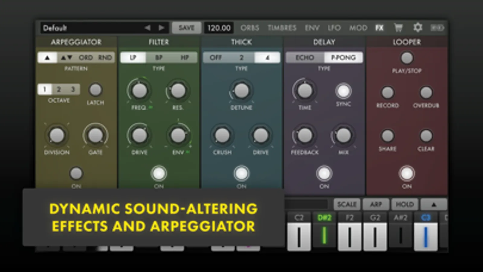 • Effects Page: A collection of dynamic sound-altering and sound-augmenting effects with Delay, Chorus, Bitcrush, Filter, Arpeggiator, and Looper. Oscilloscope-style views display the output and impact of your effects.