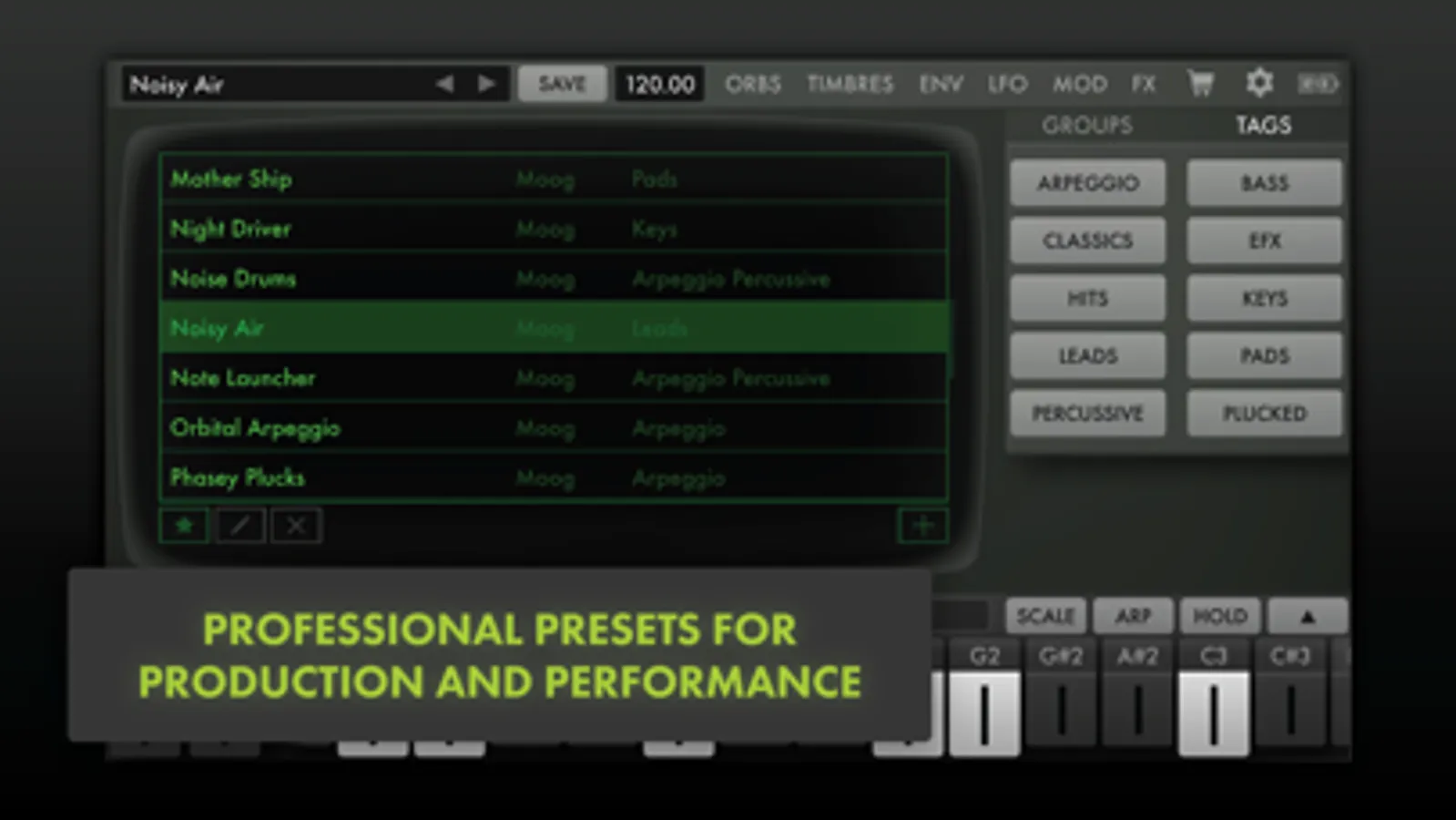 • Additional Features: Backwards compatibility with presets and timbres from the original Animoog, AUv3 support, 440Hz base frequency offset (+/- 10Hz), preset tagging, preset sharing, Global BPM, Tap Tempo, Ableton Link, keyboard typing and shortcuts, random presets, and undo/redo.