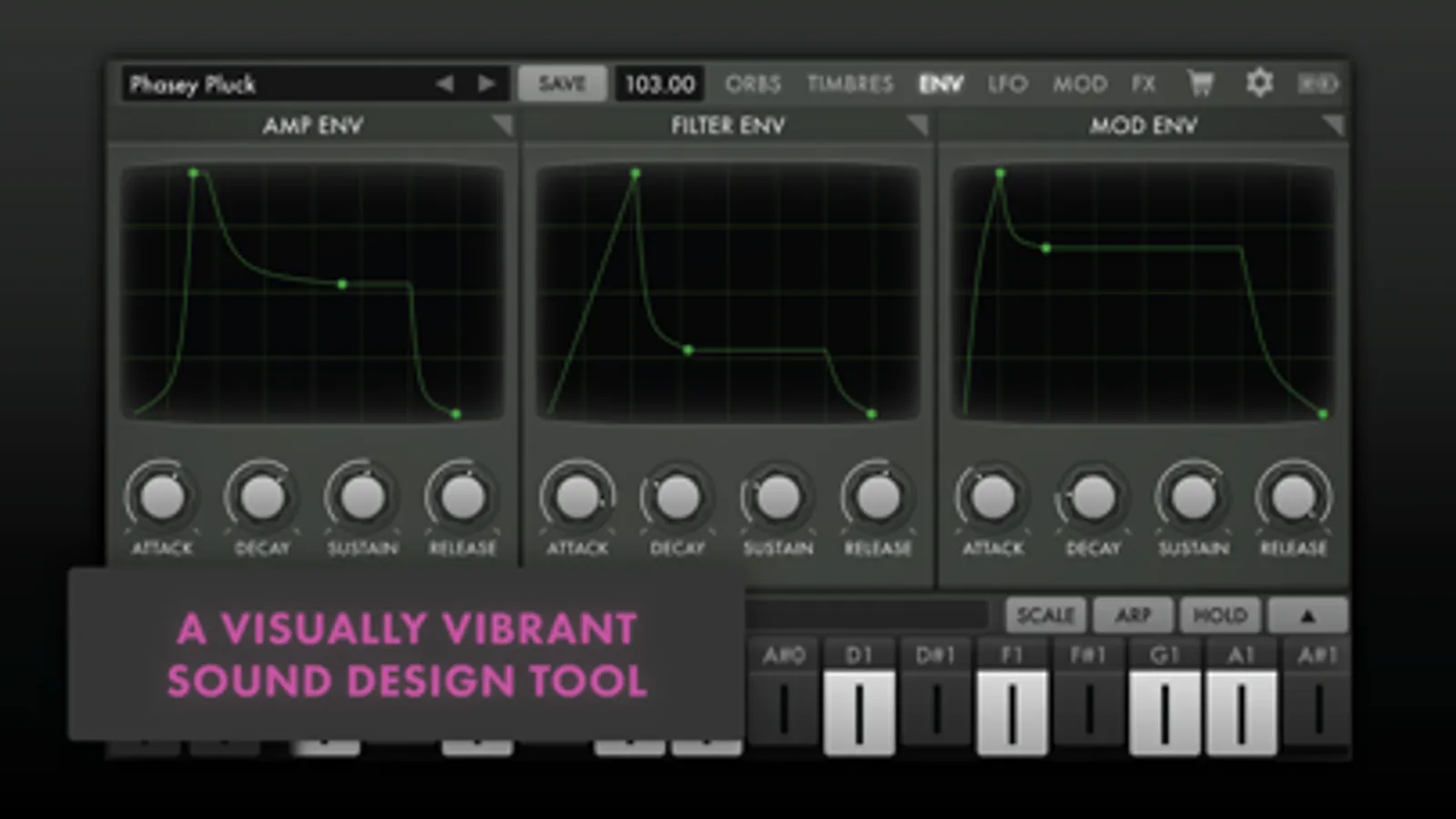 • Polyphonic Modulation and Pitch Shifting: Control Animoog Z's advanced touch surface keyboard with configurable scales, key distances, pitch correction, and glide. Simply slide your fingers to control multiple per-voice parameters in Animoog Z right from the keys.