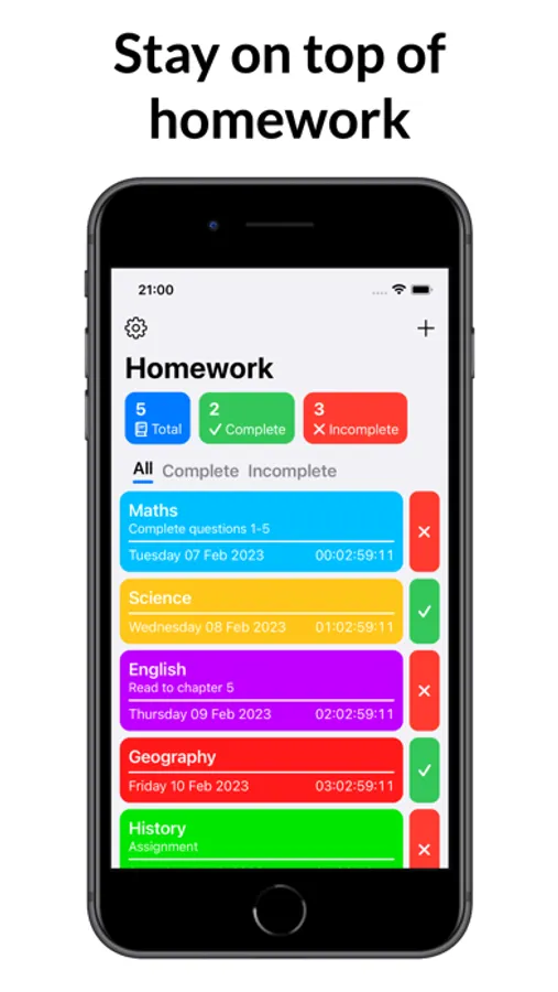 Clean and simple look to make adding, managing, viewing and deleting events and homework tasks easy. Multiple pages to help you navigate through and get an overview of upcoming events and tasks.