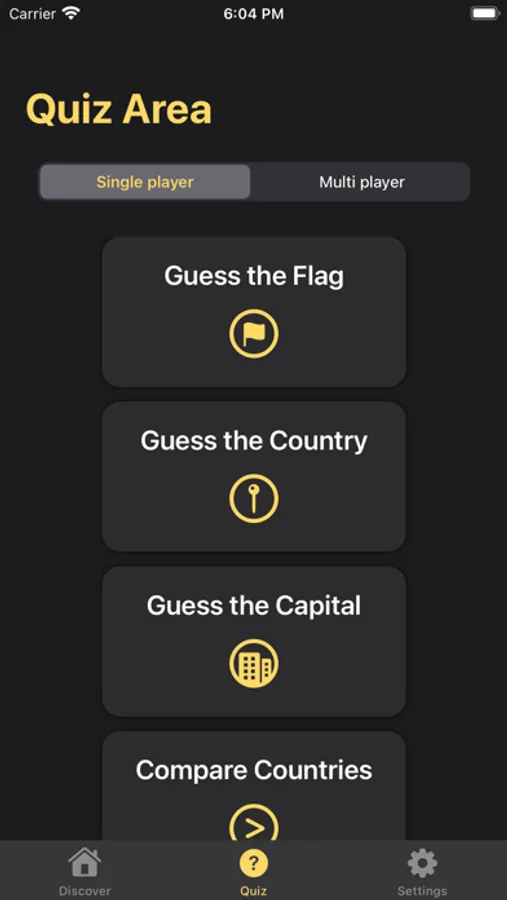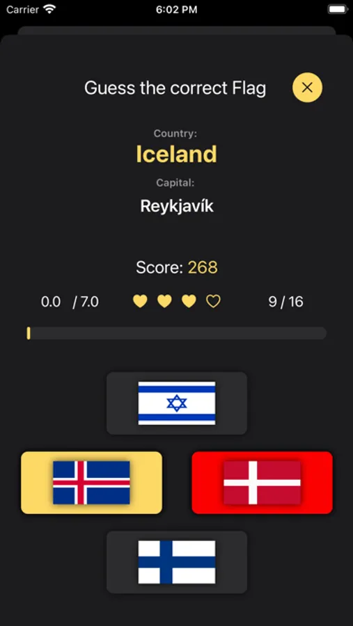 There are 6 quiz modalities: Guess the Flag, Guess the Country, Guess the Capital, Guess the Shape, Compare Countries and Trivia Quiz. Every Quiz has 9 different levels with increasing difficulty, try to get the highest scores and see your rank on the leaderboards!