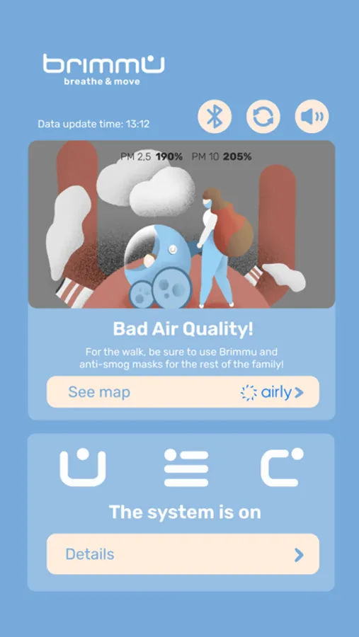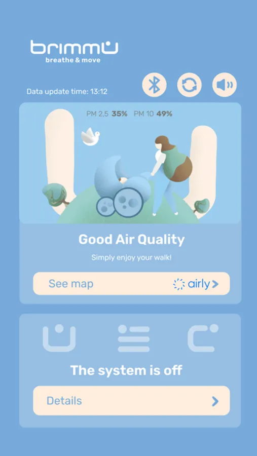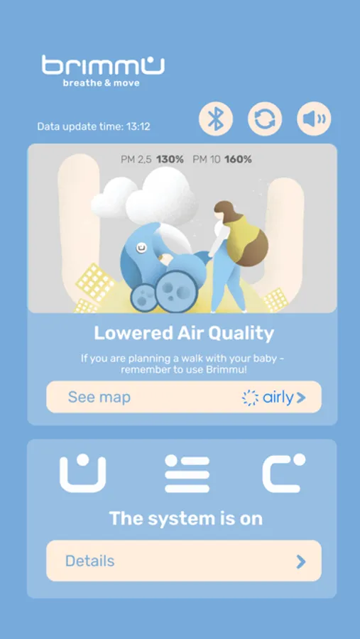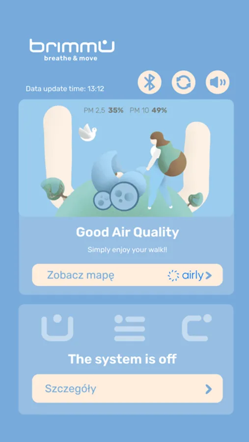The application connects via bluetooth to the BRIMMU device, which is a carriage shield with a filtrating system that protects babies from air pollution during walks. The application shows the parameters of the system, such as: the duration of the walk, the filter performance and the temperature inside carriage. In addition, it connects to Airly international air monitoring data base in order to show the current air quality in users area, indicating the need to use the device.