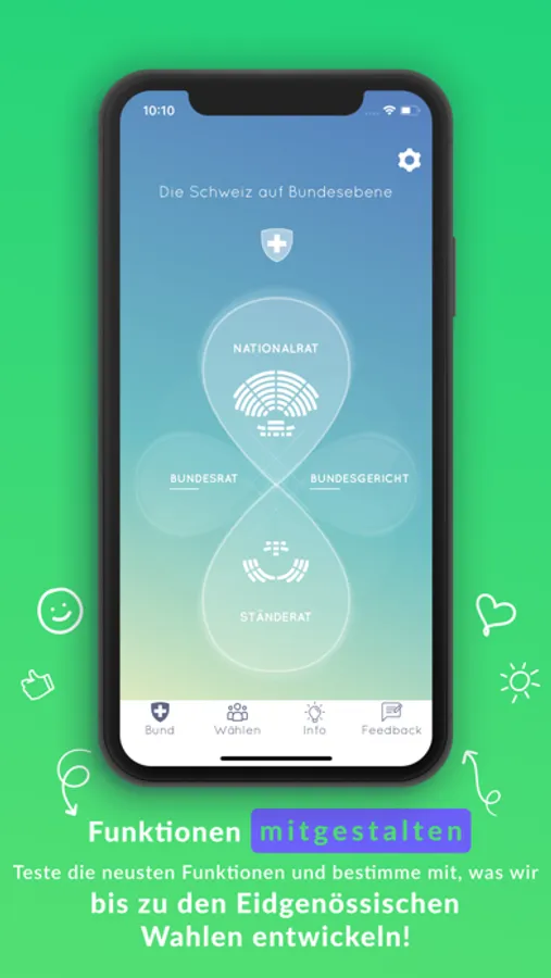 Die CH+App wird bis zu den Eidgenössischen Wahlen 2023 weiterentwickelt. Wir freuen uns auf deine Ideen!