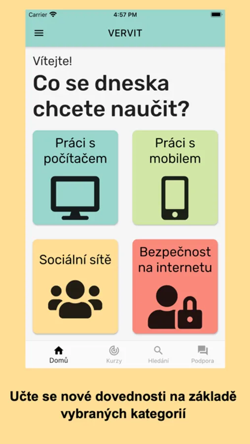 Na stránce "Domů" se přes rozcestníky můžete dostat až ke konkrétně zaměřeným videím na téma, které hledáte. Hlavními kategoriemi jsou práce s počítačem a práce s mobilem. Dále pro Vás připravujeme dvě další kategorie videí, které budou k dispozici v příštích verzích aplikace: sociální sítě a bezpečnost na internetu.