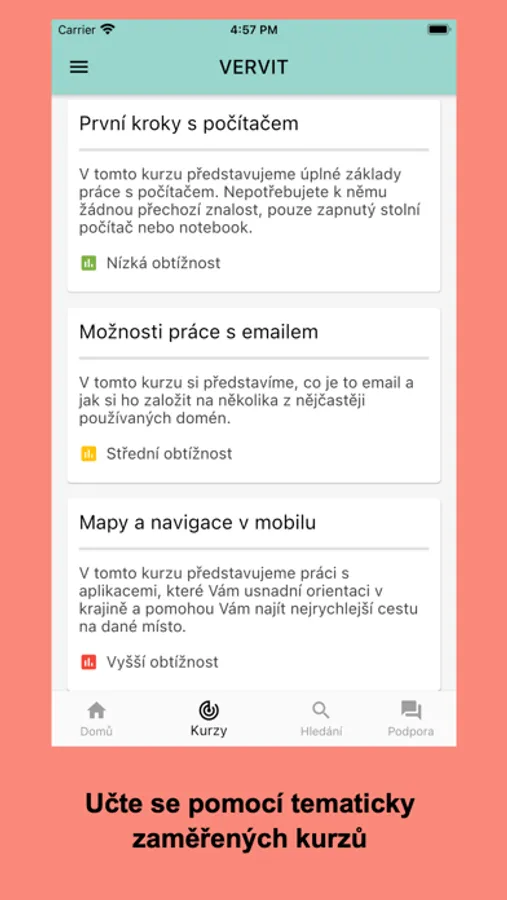 V sekci "Kurzy" můžete zhlédnout tematicky zaměřené série videí, díky kterým hlouběji porozumíte danému tématu, jako například založení e-mailové adresy nebo práce s mapou a navigací v mobilu.