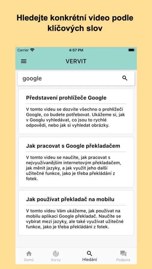 V sekci "Hledat" můžete hledat specifické instruktážní video podle klíčových slov.