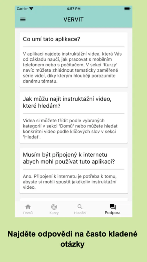 V záložce "Podpora" najdete často kladené dotazy, které se týkají používání aplikace.