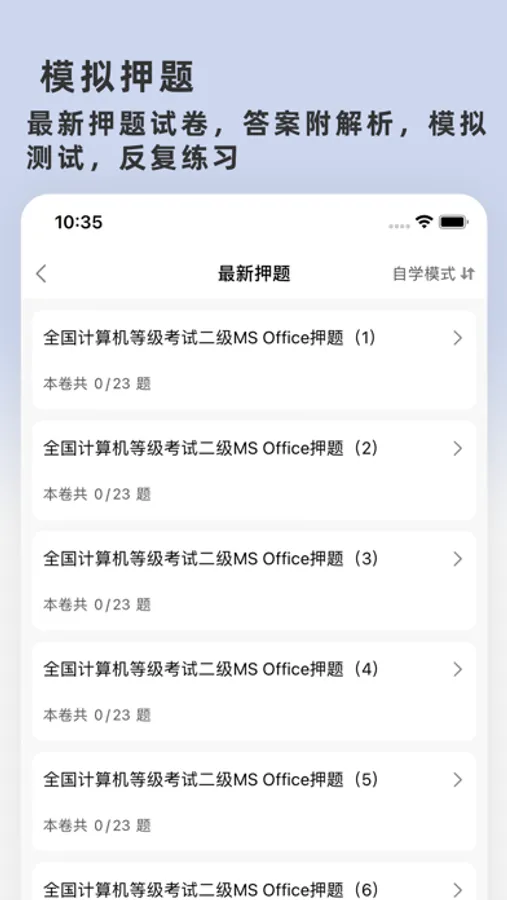 计算机二级考试题库是全国计算机等级考试app,题库含计算机二级Ms office(选择题,上机操作题:字处理题、电子表表格题、演示文稿题) 、计算机二级C语言程序设计,题库实时更新,考点+难点+易错汇总,试题真题附解析,零基础过关无压力。