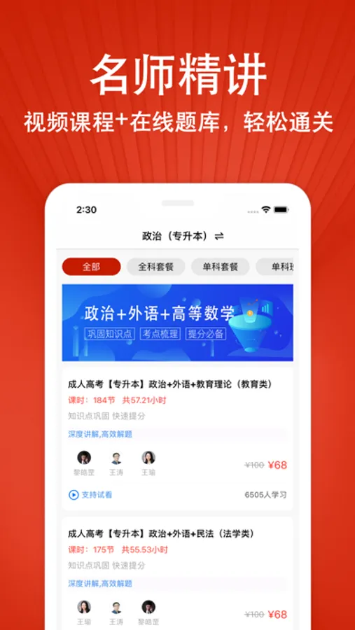 【名师精讲】视频课程+在线课程,助你通过成人专升本高考自考考试;