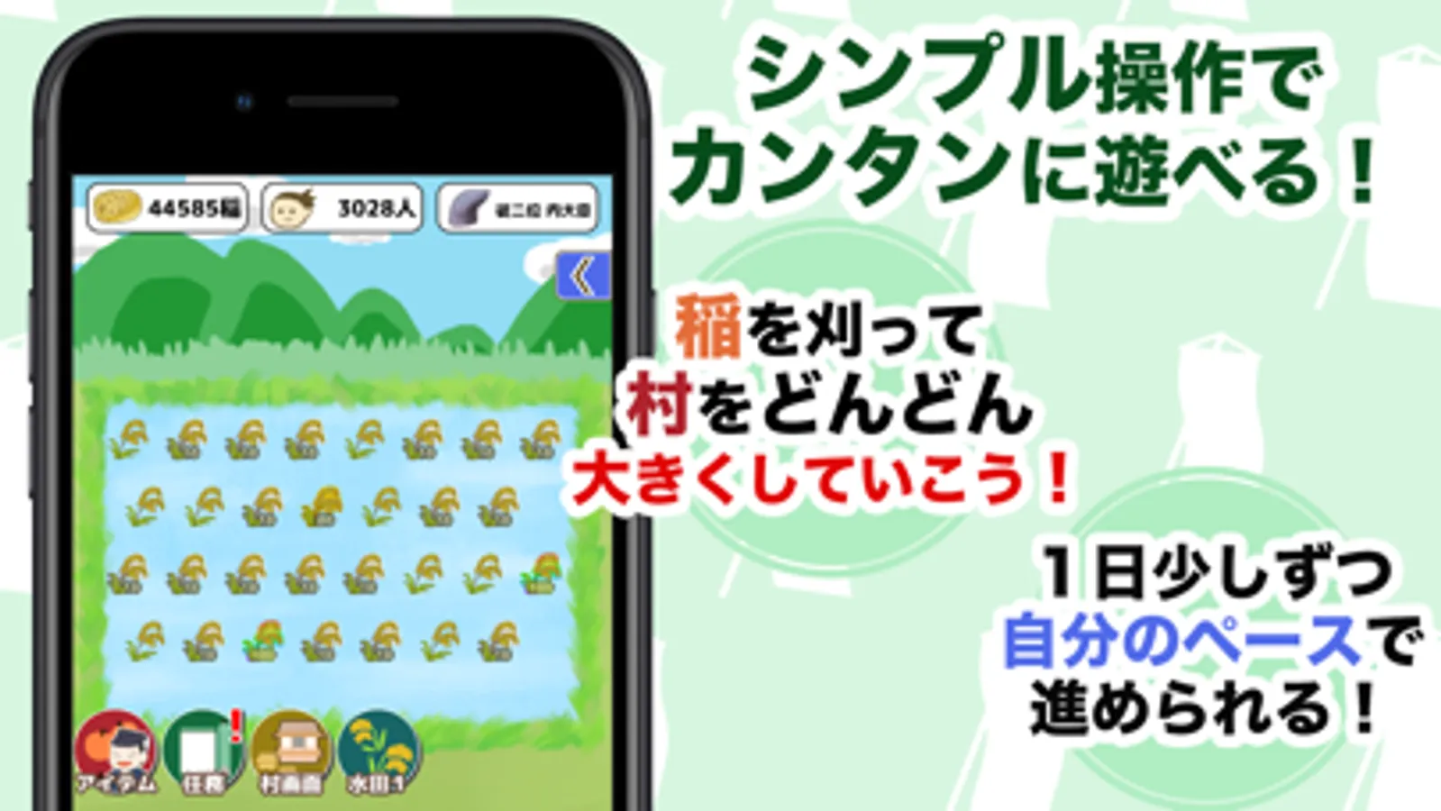 「毎日、楽しく指先スワイプで、稲を刈り、健康ヘルスケア!」
