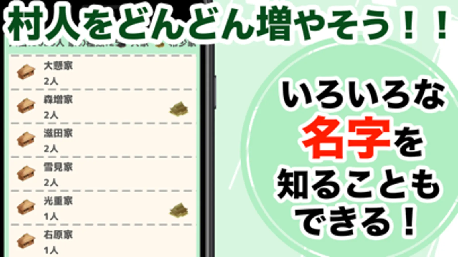 ゲーム形式で仙人の出す名字(苗字)のクイズに答えたり、侵略者と戦ったりするため、自分の知力や村育成の視点も必要とします。