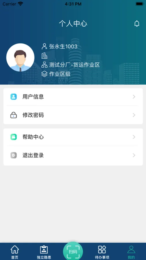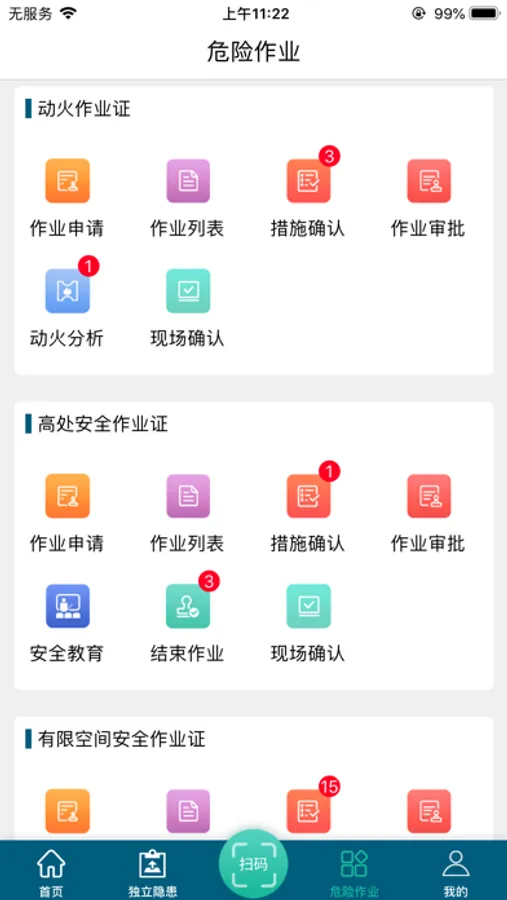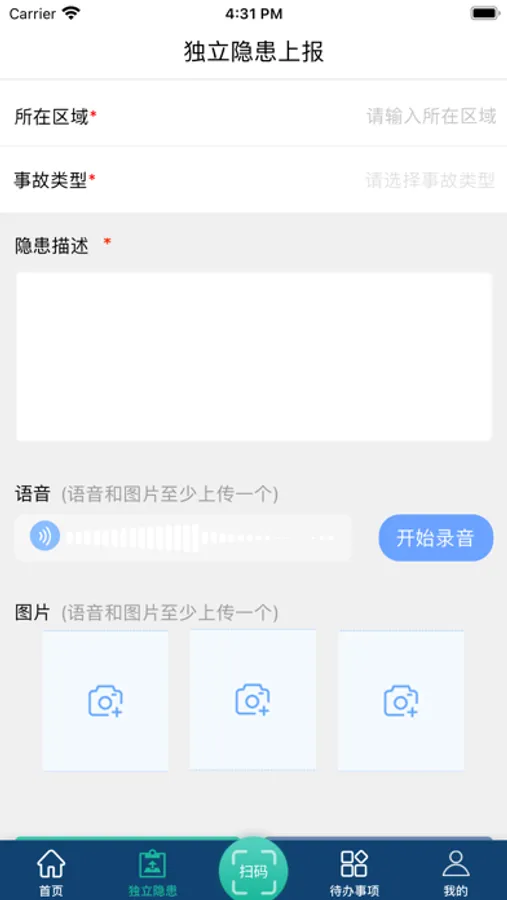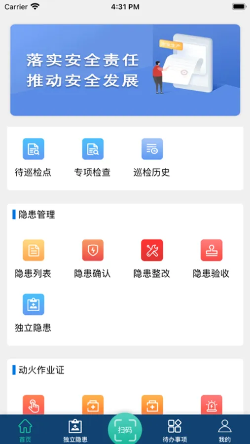 功能主要包括巡检、隐患、危险作业、应急、新闻五大功能模块,最近使用的功能将在功能区上方集中显示,方便快速使用。巡检模块可查看本人待巡检的巡检点列表、专项巡检的电子安全检查表以及巡检历史。隐患模块可进行隐患登记和独立隐患上报,不需要扫码即可随时随地上报隐患,可查看隐患上报列表和隐患整改列表,以及可以通过手机进行隐患上报审批和隐患整改审批。危险作业模块可进行危险作业申请,填写危险作业电子申请单,并通过手机开始和结束危险作业状态。应急模块可进行事故快速上报、应急响应状态发布、应急预案和应急联络方式查看。新闻模块可查看电脑端发布的法规制度、行业新闻和安全常识,用于日常的安全知识学习。首页底部为菜单栏,点击中间蓝色“扫码巡检”按钮,可扫描巡检点二维码开始日常巡检。点击隐患上报按钮,可直接进行隐患上报。点击作业申请按钮,可快速填写危险作业电子申请单。