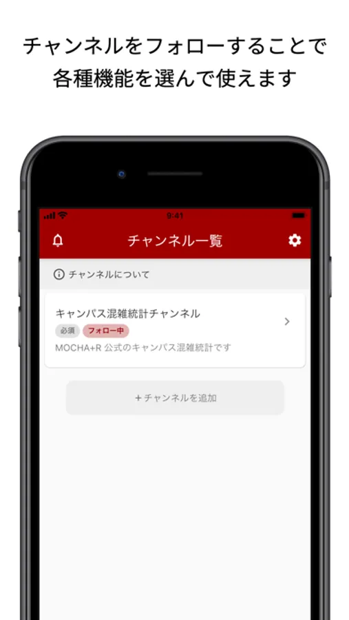 * MOCHA+Rには、混雑状況の提供や教室の予約など、様々な機能を提供する「チャンネル」が複数開設されています。参加するチャンネルを選択することで、他の利用者に公開する情報を選ぶことができます。