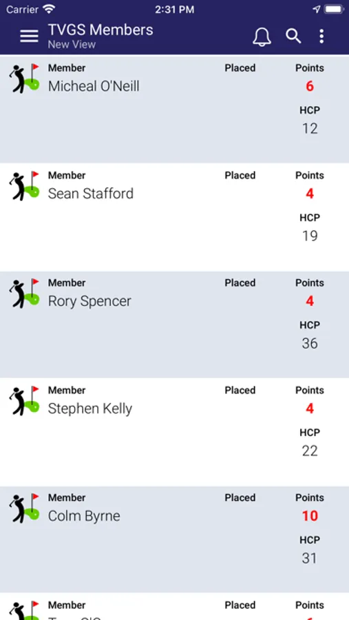 A members listing displays a list of all the current active members along with handicap and ranking information