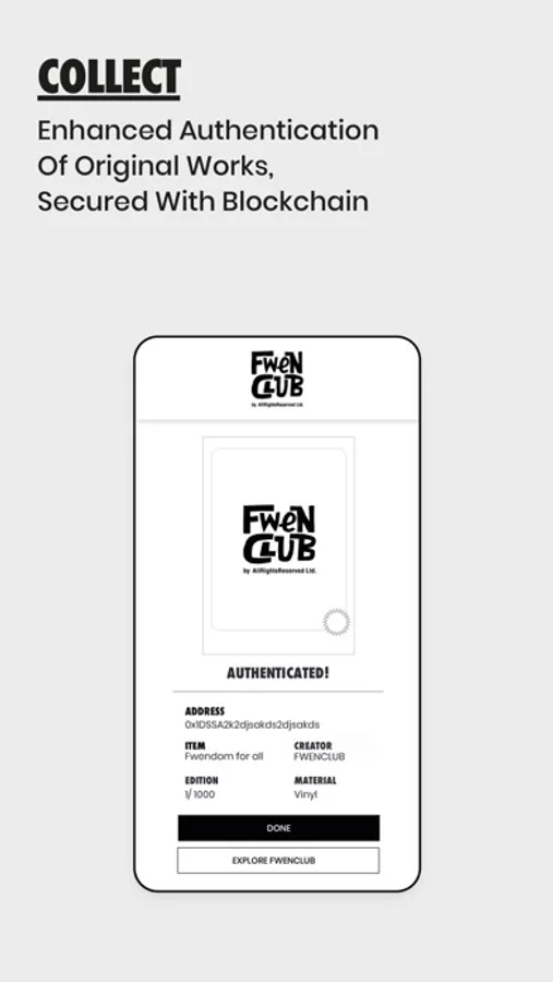 FWENCLUB is an ecosystem with blockchain technology that offers security, transparency and autonomy in authenticating creative collectibles.