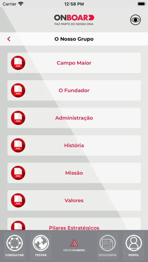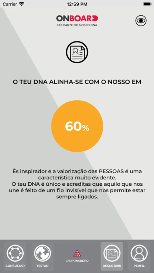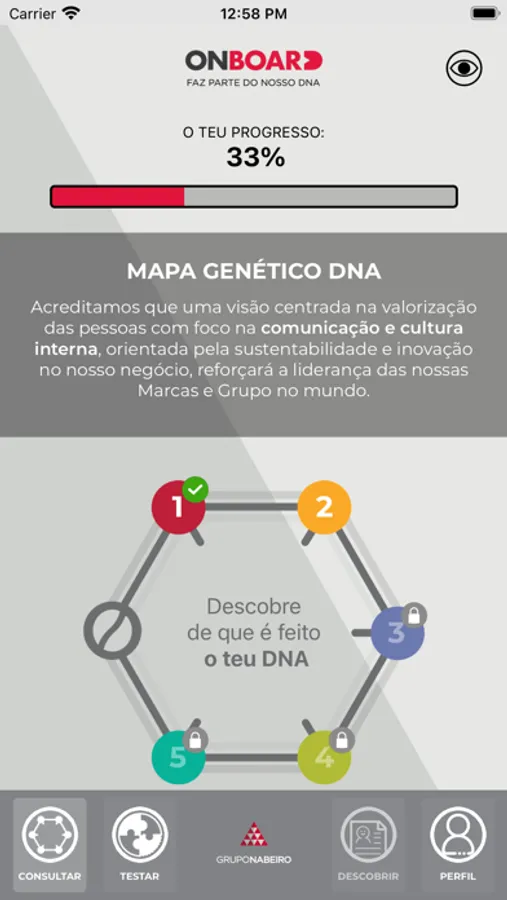 A App ONBOARD do Grupo Nabeiro é uma parte integrante do processo de acolhimento que permite aos novos colaboradores aprofundarem o seu conhecimento do Grupo de uma forma dinâmica e divertida. A missão é explorar a nossa origem e descobrir de que forma estamos ligados no futuro. O percurso está definido no nosso mapa genético e o novo colaborador terá de o percorrer para poder “herdar” e depois transmitir o nosso DNA. As nossas características base são os pilares estratégicos. Cada módulo é uma das nossas características genéticas que o novo colaborador vai ter de adquirir. Vai adquirindo através de desafios, de forma gradual, para que no teste final se consiga confirmar que de facto ele faz parte do nosso DNA e de que forma pode contribuir.