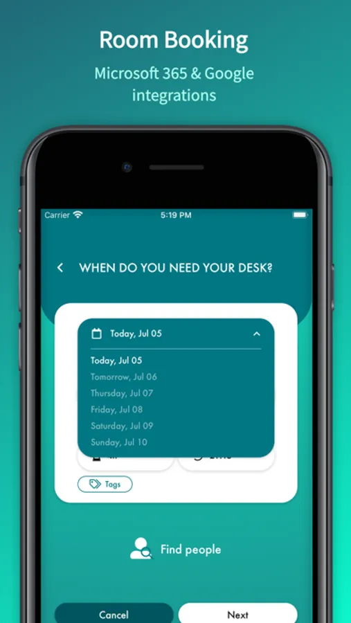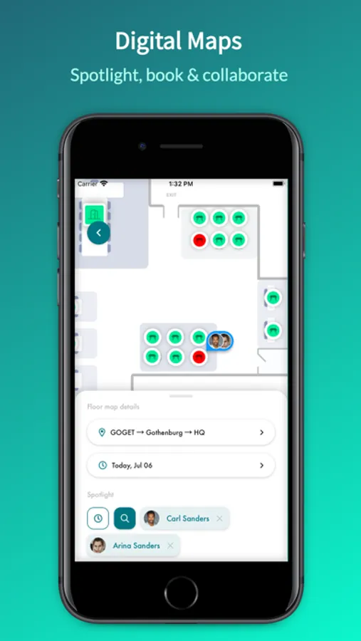 • Digital interactive maps for booking desks or rooms (or other space types, eg parking)