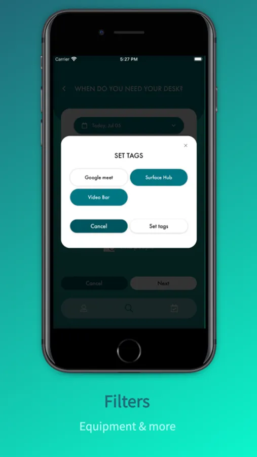 • Find suitable desks and rooms with tags or equipment filters. Eg desks tagged with "Dual monitor"