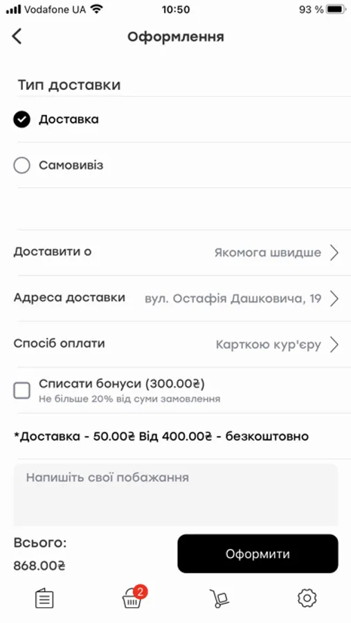 • встановити бажаний час доставки замовлення за вказаною адресою;