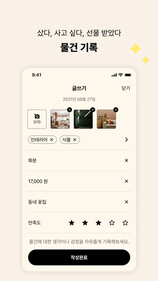 내가 산 물건, 사고 싶은 물건, 선물 받은 물건을 분류하여 기록할 수 있습니다.