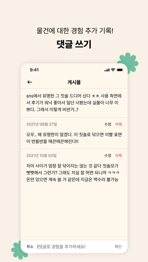 댓글 기능을 통해 물건에 대한 경험을 추가로 기록하세요.
