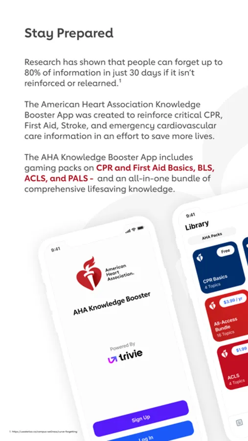 The AHA Knowledge Booster app was created to reinforce critical CPR and emergency care knowledge in an effort to save more lives. Users can choose the topics appropriate for their level of knowledge – Basic Life Support (BLS), Advanced Cardiovascular Life Support (ACLS), Pediatric Advanced Life Support (PALS), First Aid, and CPR Basics. This booster app is ideal for those who have completed American Heart Association courses and are looking to keep this lifesaving information top of mind.