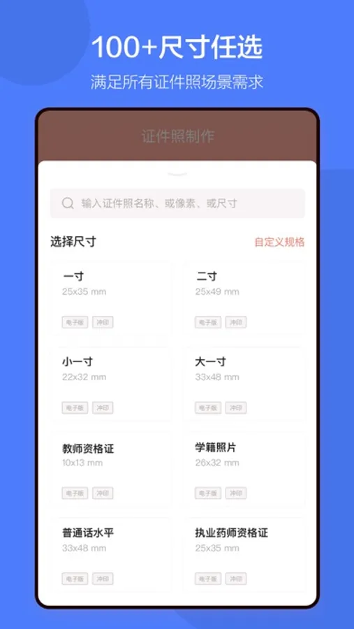 Rich specifications: Full coverage of various exam, visa and other document specifications, including one inch and two inch sizes; Resume, graduation certificate, visa, passport, examination certificate, driver's license, social security certificate, civil servant certificate, etc. are uniformly set according to standard sizes.