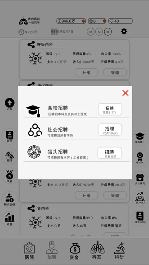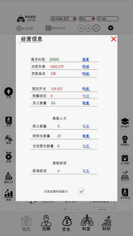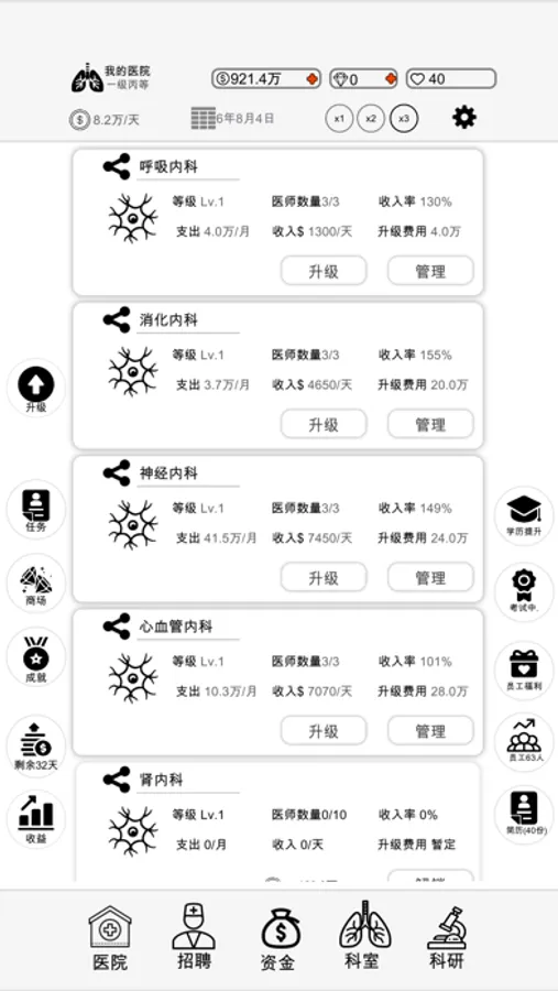 《我的医院》 是一款模拟现实的经营类型的游戏,在游戏里,你可以充当院长的角色来进行管理医院的日常事务,包括解决平时的医闹冲突,和对年轻医师们的培养,从而提高医院的经营状态和影响力。
