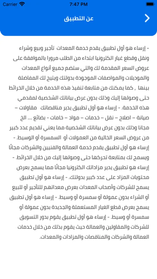 - إرساء هو أول تطبيق يقوم بدور التسويق للشركات والمقاولين والعمالة حيث يقوم بذلك من خلال خدمات العمالة والشركات والمناقصات والمزادات والمعدات.