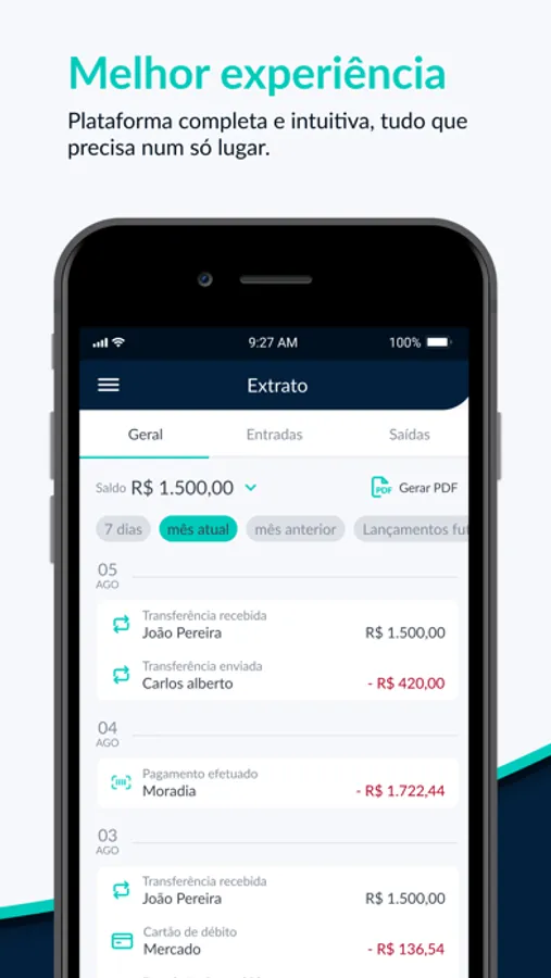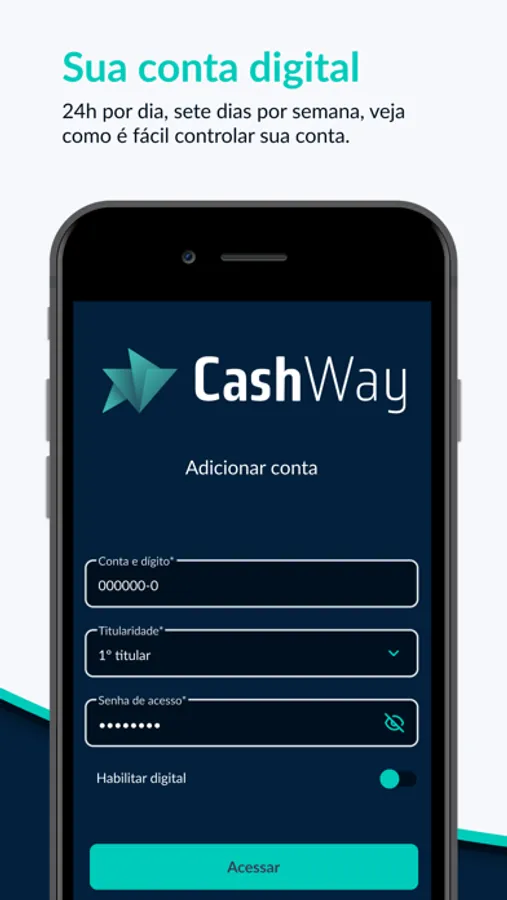 Conta Cashway é o seu home banking na palma da sua mão, disponível 24 horas por dia. Você não precisa perder tempo indo na agência se você pode resolver agora mesmo: