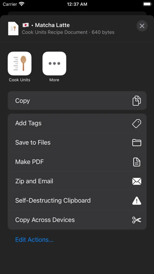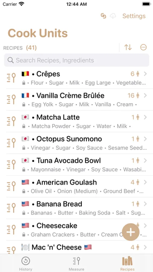 Measured ingredients can be assembled into a recipe with an associated number of servings. Recipes live in iCloud when your account is connected, and so they will appear on any device connected to the same account.