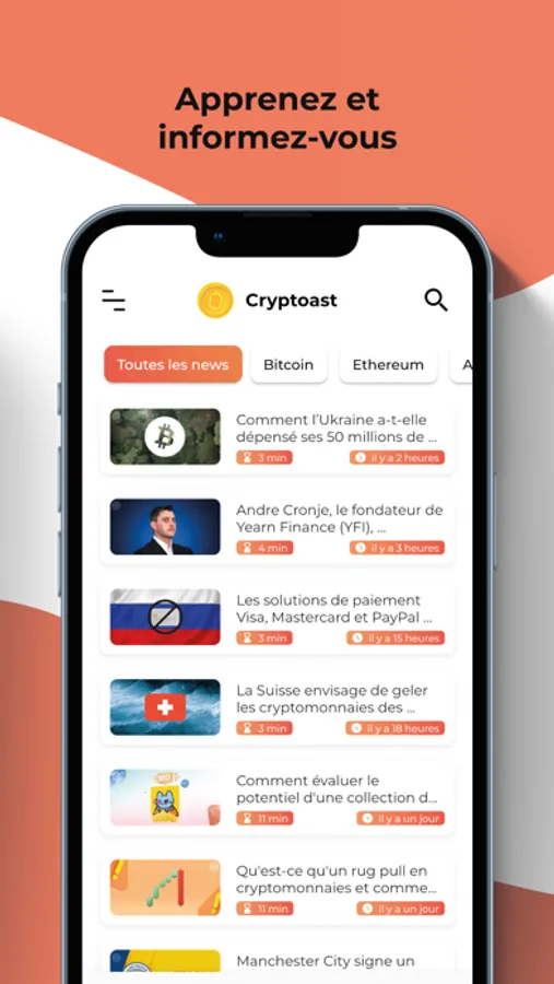 Les actualités sont classées en fonction du domaine : Bitcoin, Ethereum, Altcoins, Blockchain, NFT, Exchanges...