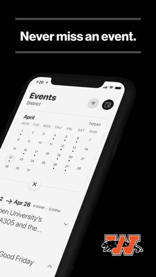 The event section shows a list of events throughout the district. Users can add an event to their calendar to share the event with friends and family with one tap.