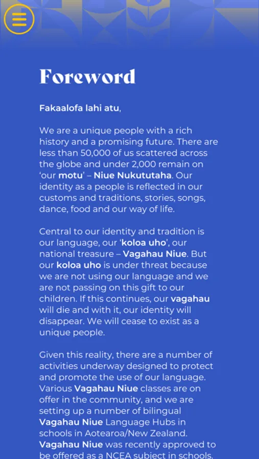 The Niuean people are a unique people with a rich history and a promising future. Central to our identity is Vagahau Niue, the Niuean language; but it is under threat because it is not being widely used and is not being passed on as gift to the next generation.