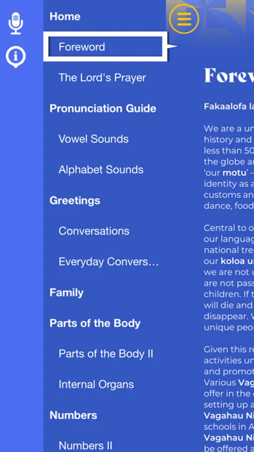 We’ve included information on the Niue alphabet, everyday conversations, family, parts of the body, numbers, colours, villages, the calendar, seasons, sports, health, time, values, proverbs, and places of work. Also featured are an interactive map showing villages; and the singing of prayers and hymns.