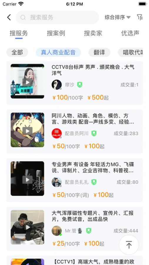 搜索配音服务、案例和配音卖家,找到想要的配音题材服务。
