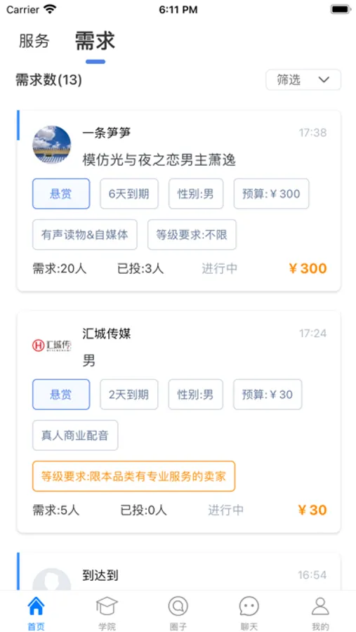 配音圈兼职是四川好声库科技有限公司 开发的真人配音在线交易配音类APP。买家可以在平台直接私聊配音员卖家进行合作,也可以发布一个招标需求,找到自己想要的声音。专业配音员、配音爱好者可以利用闲暇时间在配音圈APP里兼职接单,用自己的专业声音、好声音实现配音变现。