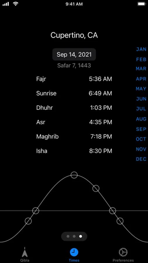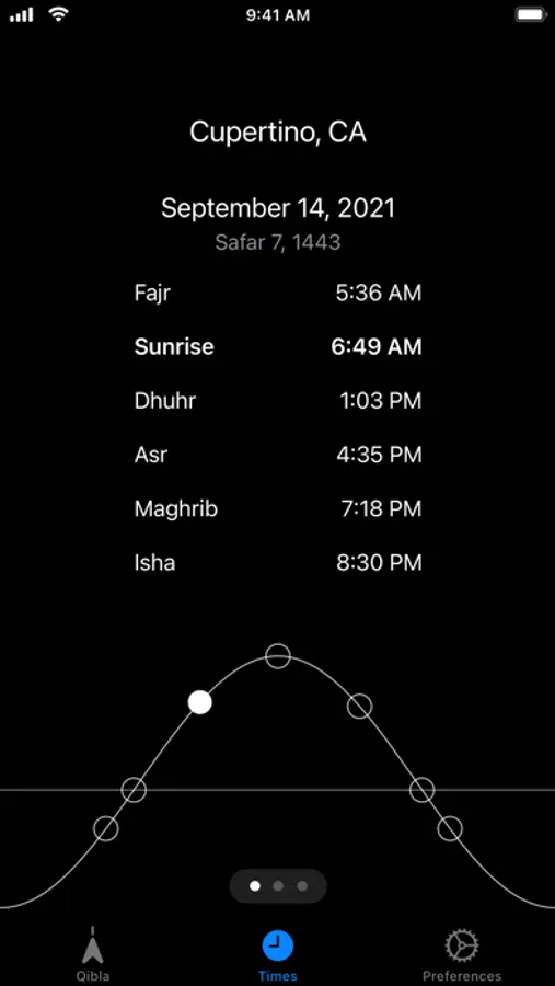 Prayer Times shows the prayer times for today and tomorrow at your current location.