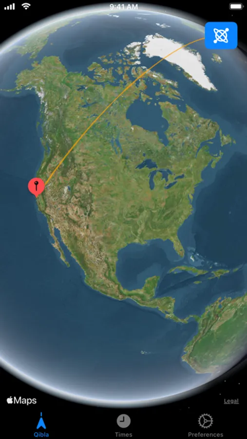 Visualize the qibla direction by overlaying the shortest line across the Earth connecting your location to the Kaaba.