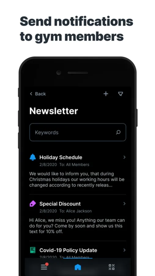 Notify gym members on new promotions or changing schedules directly through SPIRIT+ Connect. The app provides basic tools for composing messages and sending them to either all or selected users via the associated SPIRIT+ Club app.
