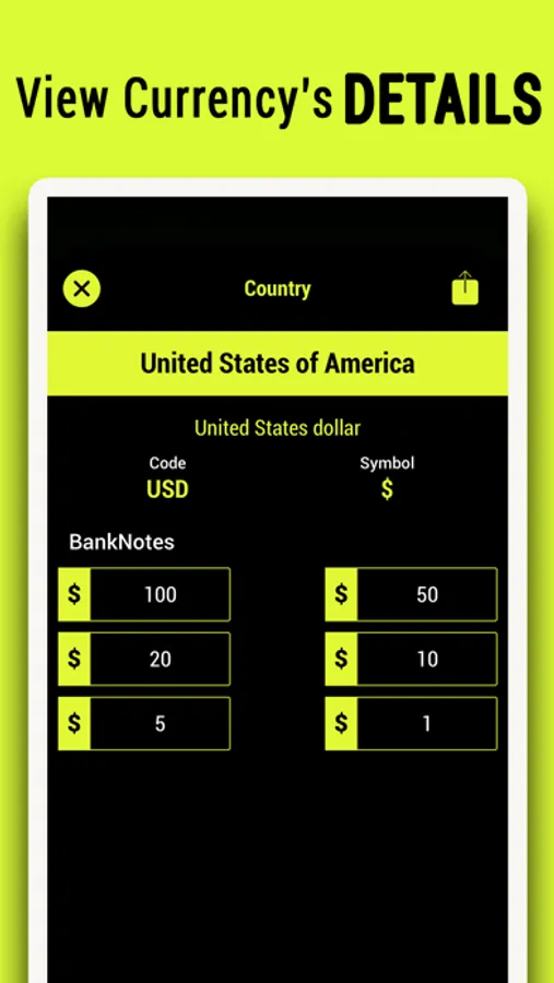 Cash Counter App also gives feature to select your countries & it shows you details of that country’s currency.
