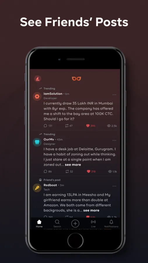 - Feed – See what your friends are posting, trending posts and topical posts anonymously on your feed.