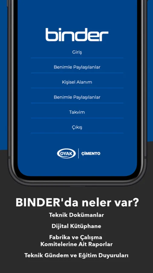 Çimento üretim süreçlerini kapsayan BINDER, endüstriyel operasyonlar ve teknolojiler kapsamındaki teknik dokümanlar ve dönemsel raporlar, ilgili yayınların bulunduğu dijital kütüphane, fabrikalar ve çalışma komitelerine ait raporlar ve veri alanları, teknik gündem duyuruları ve paylaşımlar gibi birçok özelliği barındırmaktadır. Bunlara ek olarak teknik eğitim, komite toplantıları, konferans, seminer ve webinar bilgilendirmeleri; teknik faaliyetler takvimi; çalışanların iletişim bilgileri; kişisel veri paylaşım alanları; Emisyon ve enerji tasarrufu hesaplama alanları ile birim çevirici uygulaması da bulunmaktadır.