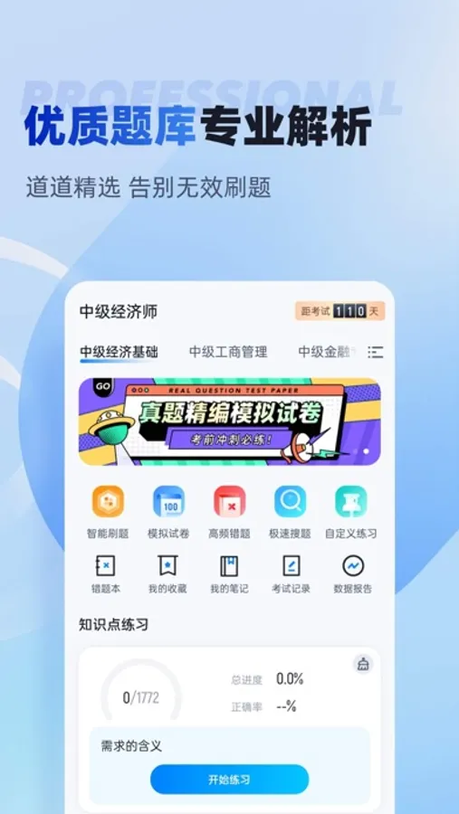 经济师APP新增模拟考试功能,经济师可按照自我练习的考点选择相对应的模拟试卷,也可选择搭配好的模拟整卷考试。