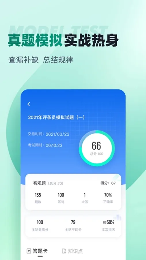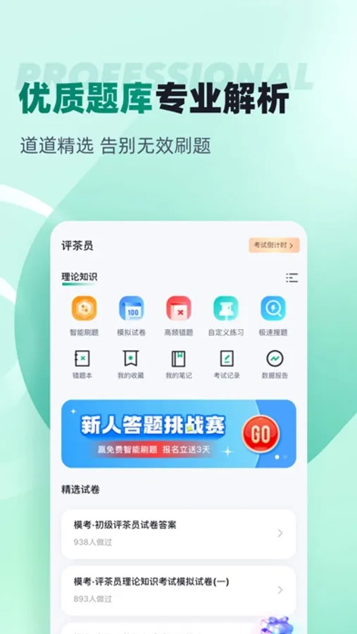 评茶员题库内含考点练习,全国通用卷以及地区卷模拟练习,以及按照固定考试比重的随机式的抽题的真题考场,成绩单实时记录考试数据,一点一滴的反馈考生近期学习状态以及自我正确率的提升,大大的给予考生通过考试的信心。