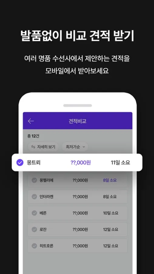 전국 여러 수선사에서 고객님께 수선 견적을 무료로 제안합니다. 발품 팔 필요없이 모바일에서 비교하고, 원하시는 수선 견적을 선택하실 수 있습니다.
