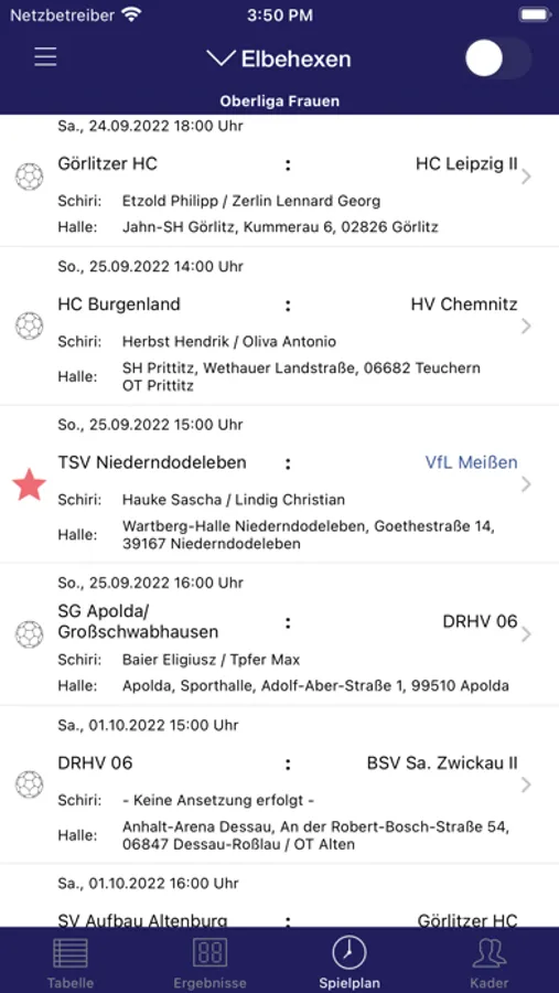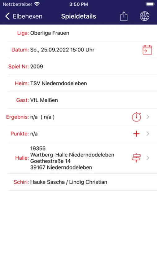 - Details zu einem Spiel (z.B. Datum, Uhrzeit, Halbzeitergebnis, Schiedsrichteransetzung, Hallenanschrift etc.)