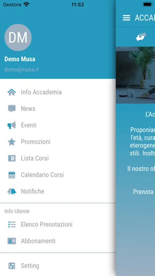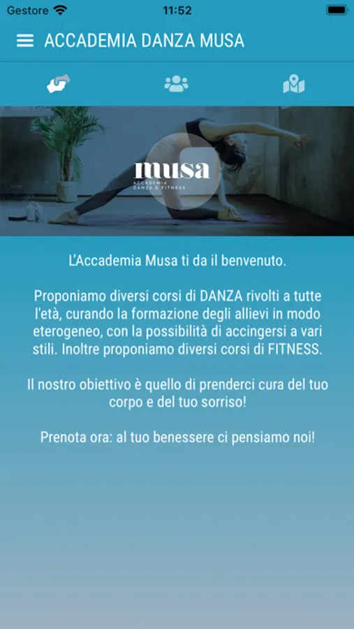 Ciao benvenuto nell’App di Musa Accademia Danza e Fitness. Grazie a questa applicazione, avrai la possibilità di prenotare la lezione di tuo interesse, visualizzare il calendario dei corsi, controllare il tuo abbonamento e la validità del tuo certificato medico. Scarica l'App, crea il tuo account e compila tutti i moduli. Noi ti aspettiamo in Accademia!